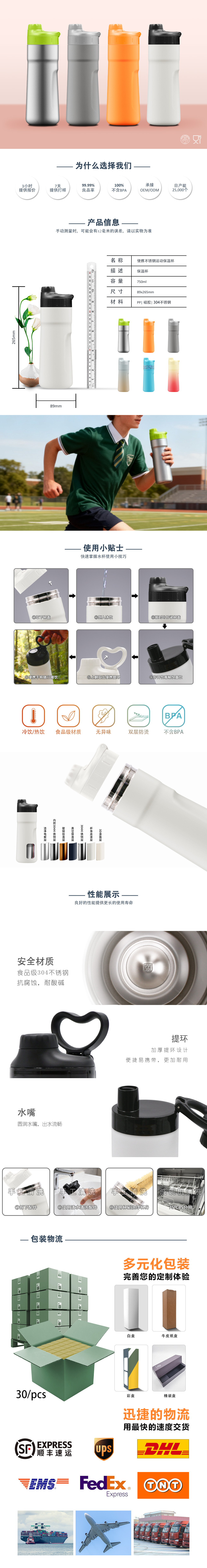 源头工厂750毫升户外运动304不锈钢无铅真空水瓶